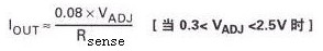 調(diào)節(jié)針可通過外置的直流電壓(VADJ)進行過驅(qū)動,以獲得超過內(nèi)置的電壓基準,并調(diào)整輸出電流使其超出或低于額定值。此時的額定輸出電流為: